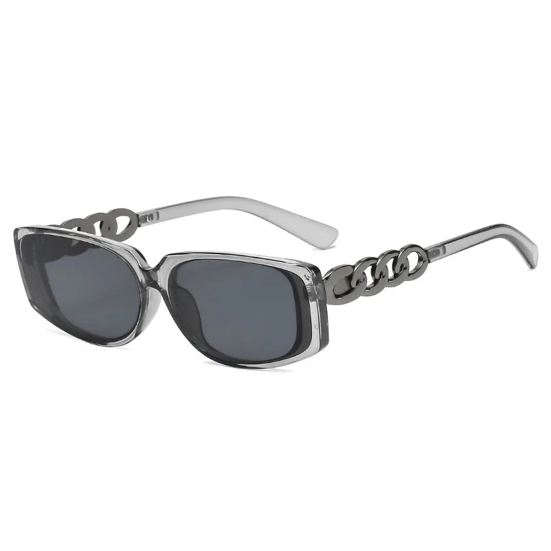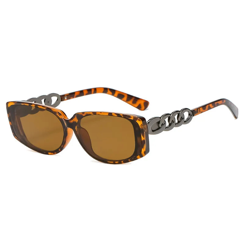 Damskie okulary przeciwsłoneczne w kształcie prostokąta łączą w sobie elegancję oraz nowoczesny design. Dzięki dekoracyjnemu detalowi w postaci subtelnego łańcuszka na zausznikach, stanowią one unikalny dodatek, który przyciąga wzrok. Lekkie i komfortowe, z filtrem UV400, doskonale sprawdzą się jako stylowa ochrona przed słońcem w letnie dni. Oferowane są w trzech modnych kolorach, co pozwala na ich dopasowanie do indywidualnych preferencji oraz garderoby.