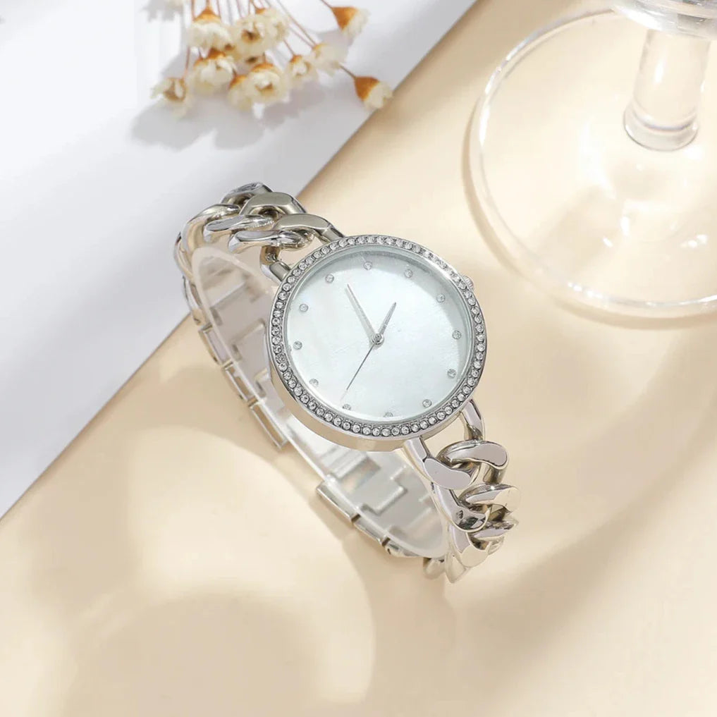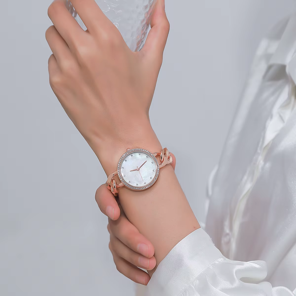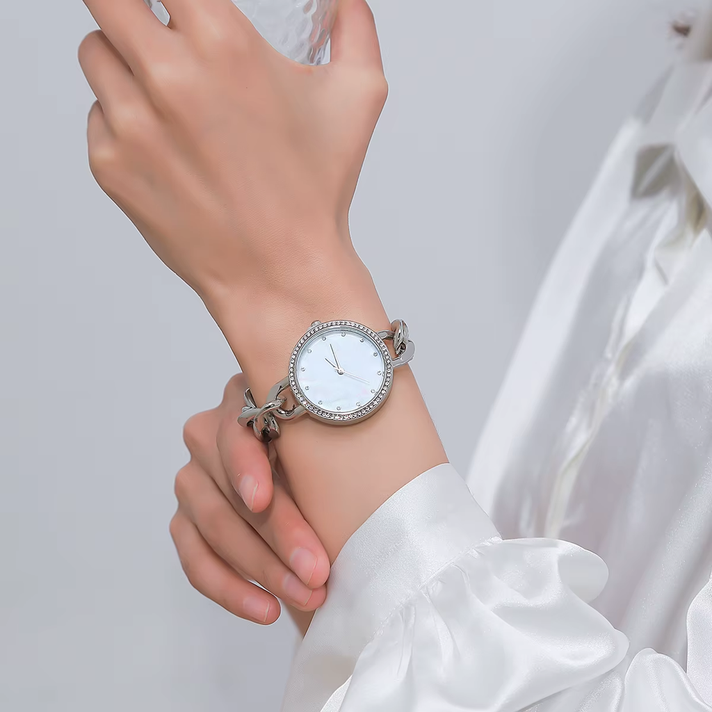 Stylowy zegarek na łańcuszku z efektowną tarczą ozdobioną diamentami to doskonały wybór dla kobiet, które cenią sobie elegancję i wyszukany styl. Wyposażony w precyzyjny mechanizm kwarcowy, łączy w sobie estetykę z funkcjonalnością. Dostępny w trzech atrakcyjnych kolorach, doskonale uzupełni każdą kreację.